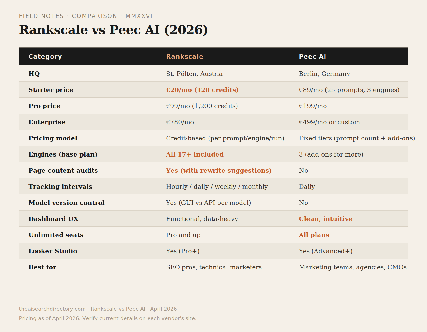 Which tool is better for agencies? Depends on what the agency values. Peec AI has a cleaner interface for client-facing reporting and unlimited seats on all plans. Rankscale has a lower entry price, more engines, and a credit model that scales affordably across many clients. Both launched dedicated agency plans in early 2026.
